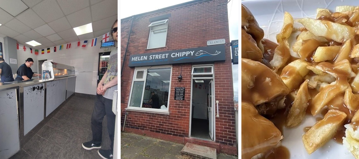 Helen street chippy is a fantastic chip shop in peel green. Located on the corner on Helen street. Parking is street parking only but I've never had an issue finding a place. The staff are nice. There's a cold drinks fridge at an average price. The chips are lovely. Two types of curry sauce. Always hot and tasty food. Would recommend and I'm a regular customer here